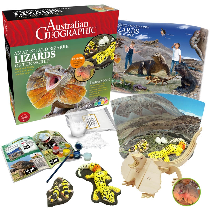 Make, custom paint, and varnish your own life-size gecko and her hatching eggs. Assemble a detailed 3D model of a frilled-neck lizard. Build and decorate your museum quality diorama. Put up the beautiful poster and learn the secret science of 10 of the world’s most amazing and bizarre lizards. Beautifully written and illustrated full-colour instruction booklet.