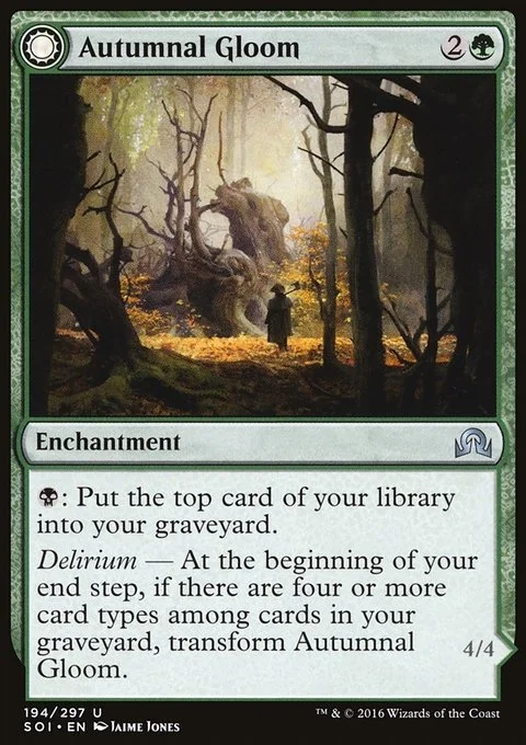Autumnal Gloom {B}: Mill a card. Delirium — At the beginning of your end step, if there are four or more card types among cards in your graveyard, transform Autumnal Gloom. Ancient of the Equinox Trample, hexproof