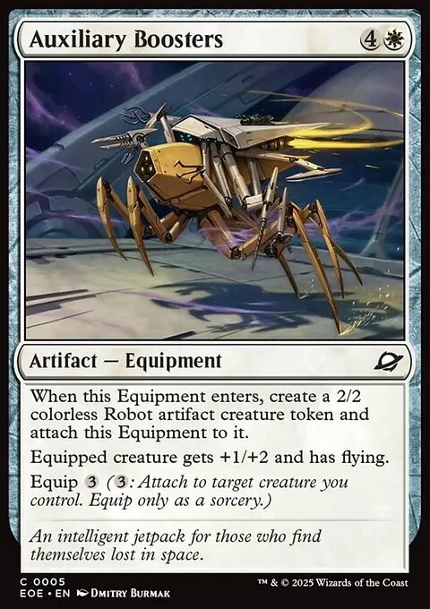 When this Equipment enters, create a 2/2 colorless Robot artifact creature token and attach this Equipment to it. Equipped creature gets +1/+2 and has flying. Equip {3} ({3}: Attach to target creature you control. Equip only as a sorcery.)