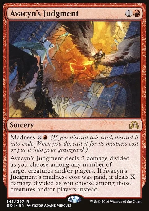 Avacyn's Judgment deals 2 damage divided as you choose among any number of targets. If this spell's madness cost was paid, it deals X damage divided as you choose among those permanents and/or players instead.