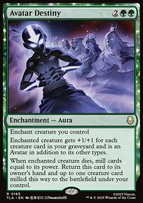 Enchant creature you control Enchanted creature gets +1/+1 for each creature card in your graveyard and is an Avatar in addition to its other types. When enchanted creature dies, mill cards equal to its power. Return this card to its owner's hand and up to one creature card milled this way to the battlefield under your control.