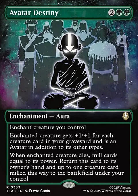 Enchant creature you control Enchanted creature gets +1/+1 for each creature card in your graveyard and is an Avatar in addition to its other types. When enchanted creature dies, mill cards equal to its power. Return this card to its owner's hand and up to one creature card milled this way to the battlefield under your control.