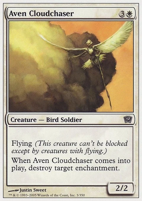 Flying (This creature can't be blocked except by creatures with flying or reach.) When Aven Cloudchaser enters, destroy target enchantment.
