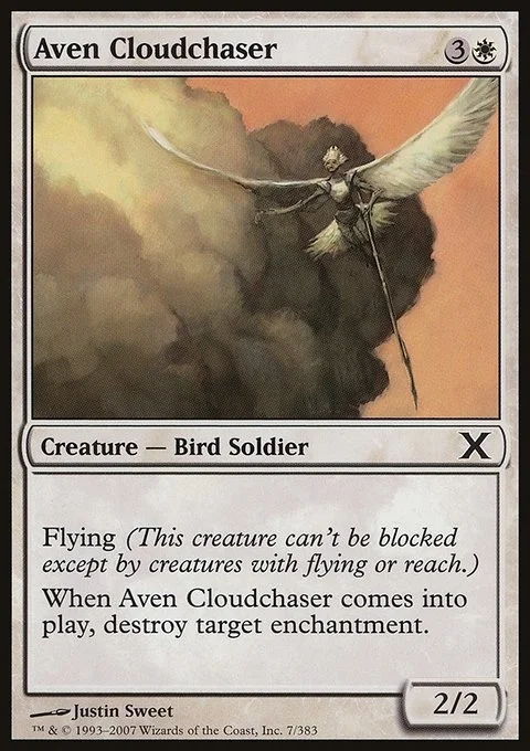 Flying (This creature can't be blocked except by creatures with flying or reach.) When Aven Cloudchaser enters, destroy target enchantment.