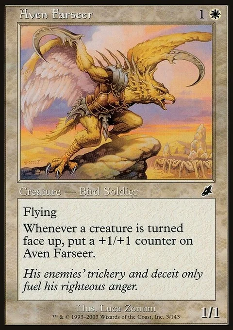 Flying Whenever a permanent is turned face up, put a +1/+1 counter on Aven Farseer.