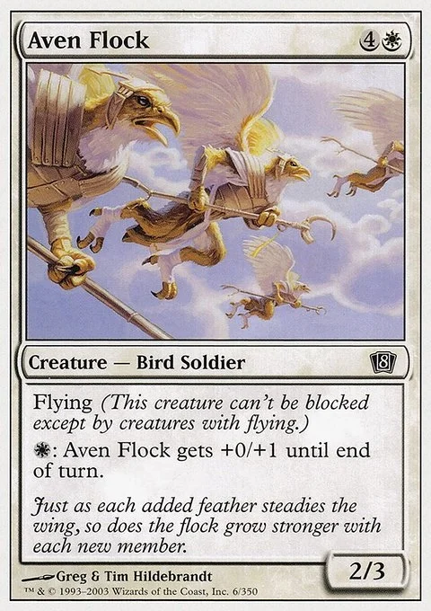 Flying (This creature can't be blocked except by creatures with flying or reach.) {W}: Aven Flock gets +0/+1 until end of turn.