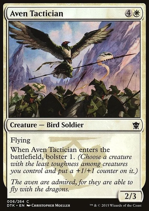 Flying When Aven Tactician enters the battlefield, bolster 1. (Choose a creature with the least toughness among creatures you control and put a +1/+1 counter on it.)