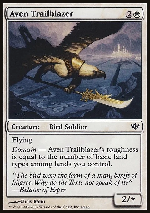Flying Domain — Aven Trailblazer's toughness is equal to the number of basic land types among lands you control.