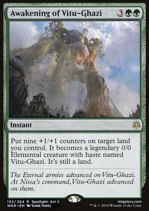 Put nine +1/+1 counters on target land you control. It becomes a legendary 0/0 Elemental creature with haste named Vitu-Ghazi. It's still a land.