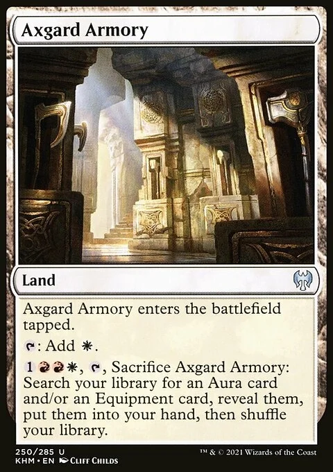 This land enters tapped. {T}: Add {W}. {1}{R}{R}{W}, {T}, Sacrifice this land: Search your library for an Aura card and/or an Equipment card, reveal them, put them into your hand, then shuffle.