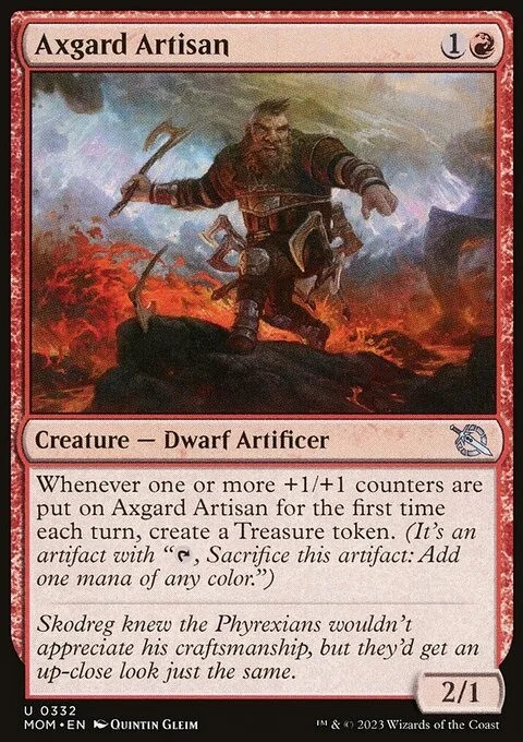 Whenever one or more +1/+1 counters are put on Axgard Artisan for the first time each turn, create a Treasure token. (It's an artifact with "{T}, Sacrifice this artifact: Add one mana of any color.")