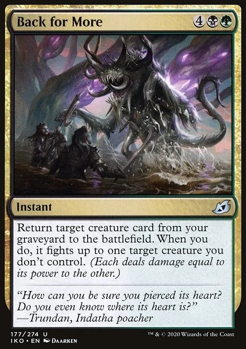 Return target creature card from your graveyard to the battlefield. When you do, it fights up to one target creature you don't control. (Each deals damage equal to its power to the other.)