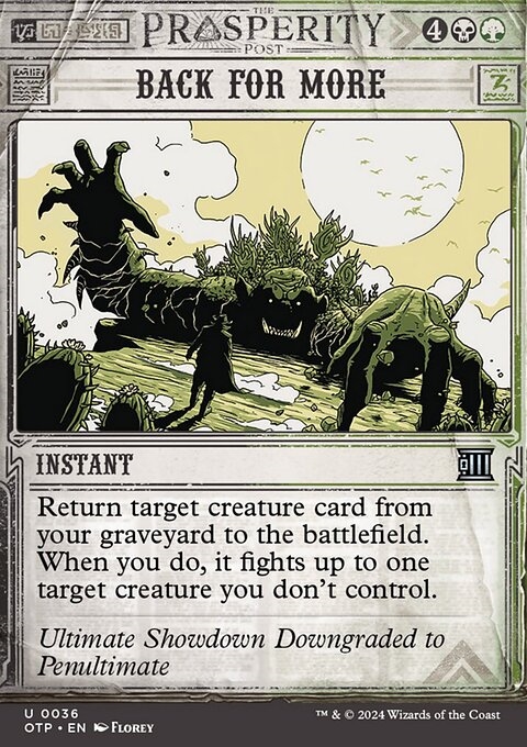 Return target creature card from your graveyard to the battlefield. When you do, it fights up to one target creature you don't control. (Each deals damage equal to its power to the other.)