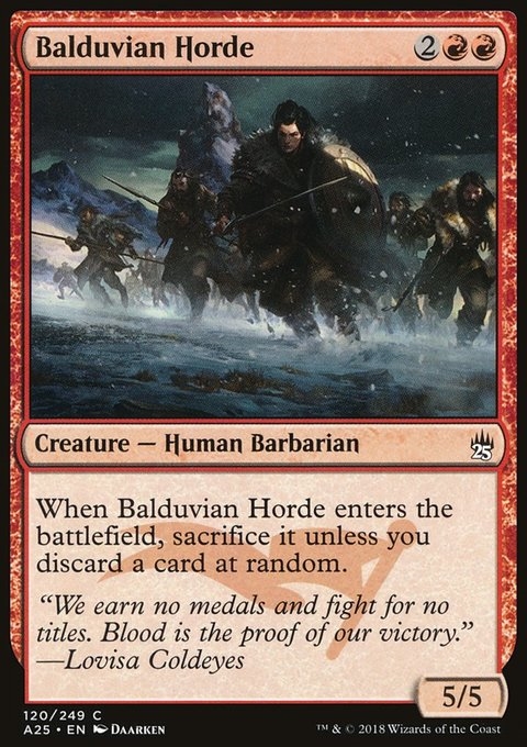 When Balduvian Horde enters the battlefield, sacrifice it unless you discard a card at random.