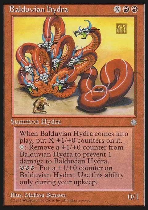 When Balduvian Hydra comes into play, put X +1/+0 counters on it.0: Remove a +1/+0 counter from Balduvian Hydra to prevent 1 damage to Balduvian Hydra.RRR: Put a +1/+0 counter on Balduvian Hydra. Use this ability only during your upkeep.