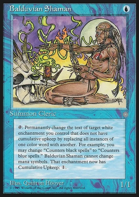 {T}: Change the text of target white enchantment you control that doesn't have cumulative upkeep by replacing all instances of one color word with another. (For example, you may change "black creatures can't attack" to "blue creatures can't attack.") That enchantment gains "Cumulative upkeep {1}." (At the beginning of its controller's upkeep, that player puts an age counter on it, then sacrifices it unless they pay its upkeep cost for each age counter on it.)