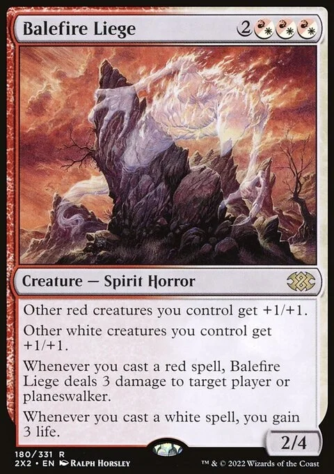 Other red creatures you control get +1/+1. Other white creatures you control get +1/+1. Whenever you cast a red spell, this creature deals 3 damage to target player or planeswalker. Whenever you cast a white spell, you gain 3 life.