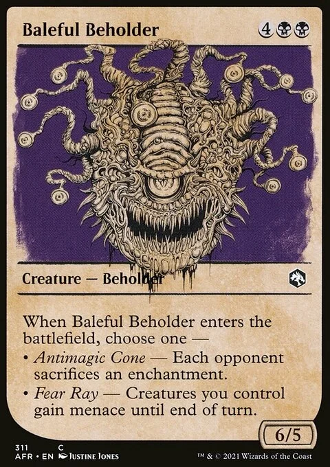 When Baleful Beholder enters the battlefield, choose one — • Antimagic Cone — Each opponent sacrifices an enchantment. • Fear Ray — Creatures you control gain menace until end of turn. (A creature with menace can't be blocked except by two or more creatures.)
