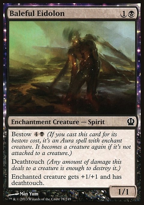 Bestow {4}{B} (If you cast this card for its bestow cost, it's an Aura spell with enchant creature. It becomes a creature again if it's not attached to a creature.) Deathtouch (Any amount of damage this deals to a creature is enough to destroy it.) Enchanted creature gets +1/+1 and has deathtouch.