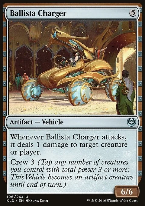 Whenever Ballista Charger attacks, it deals 1 damage to any target. Crew 3 (Tap any number of creatures you control with total power 3 or more: This Vehicle becomes an artifact creature until end of turn.)
