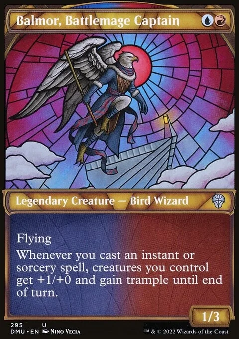 Flying Whenever you cast an instant or sorcery spell, creatures you control get +1/+0 and gain trample until end of turn.