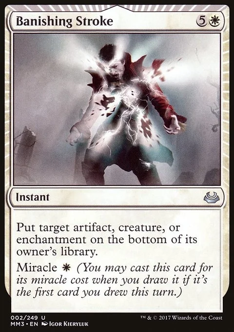 Put target artifact, creature, or enchantment on the bottom of its owner's library. Miracle {W} (You may cast this card for its miracle cost when you draw it if it's the first card you drew this turn.)