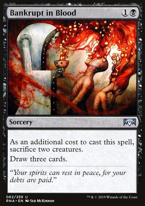 As an additional cost to cast this spell, sacrifice two creatures. Draw three cards.