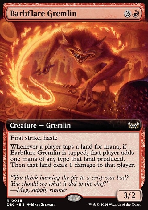 First strike, haste Whenever a player taps a land for mana, if Barbflare Gremlin is tapped, that player adds one mana of any type that land produced. Then that land deals 1 damage to that player.
