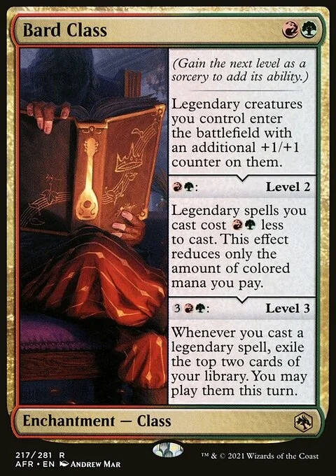 (Gain the next level as a sorcery to add its ability.) Legendary creatures you control enter the battlefield with an additional +1/+1 counter on them. {R}{G}: Level 2 Legendary spells you cast cost {R}{G} less to cast. This effect reduces only the amount of colored mana you pay. {3}{R}{G}: Level 3 Whenever you cast a legendary spell, exile the top two cards of your library. You may play them this turn.