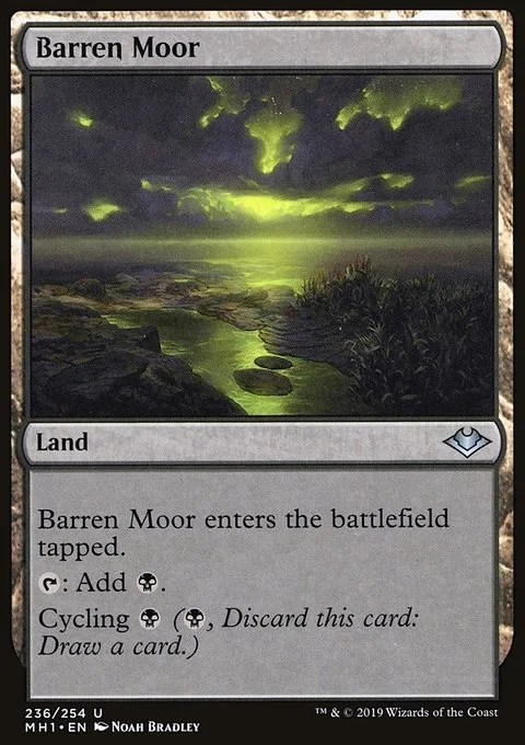 Barren Moor enters the battlefield tapped. {T}: Add {B}. Cycling {B} ({B}, Discard this card: Draw a card.)