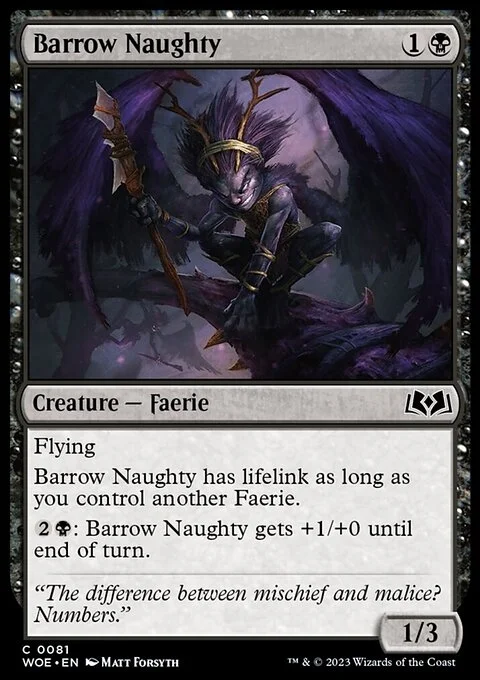 Flying This creature has lifelink as long as you control another Faerie. {2}{B}: This creature gets +1/+0 until end of turn.