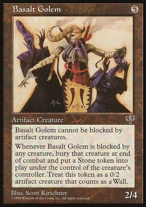 Basalt Golem cannot be blocked by artifact creatures.Whenever Basalt Golem is blocked by any creature, bury that creature at end of combat and put a Stone token into play under the control of the creature’s controller. Treat this token as a 0/2 artifact creature that counts as a Wall.