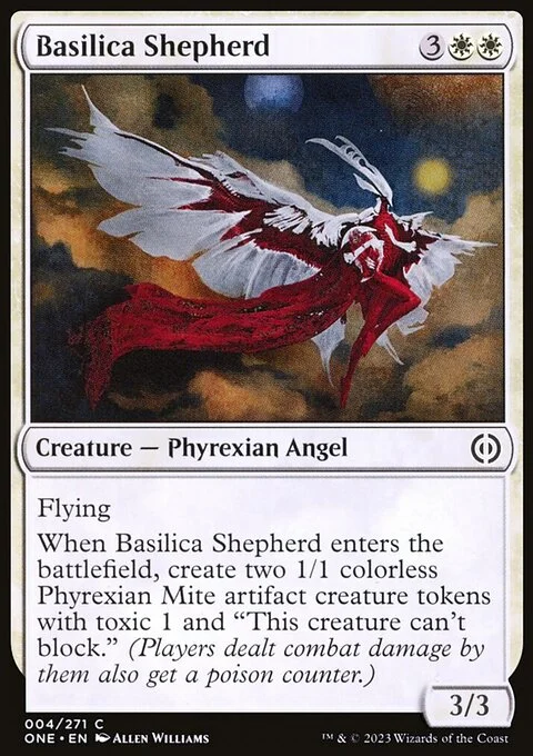 Flying When this creature enters, create two 1/1 colorless Phyrexian Mite artifact creature tokens with toxic 1 and "This token can't block." (Players dealt combat damage by them also get a poison counter.)