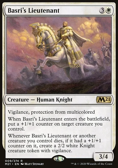 Whenever Basri's Lieutenant or another creature you control dies, if it had a +1/+1 counter on it, create a 2/2 white Knight creature token with vigilance.