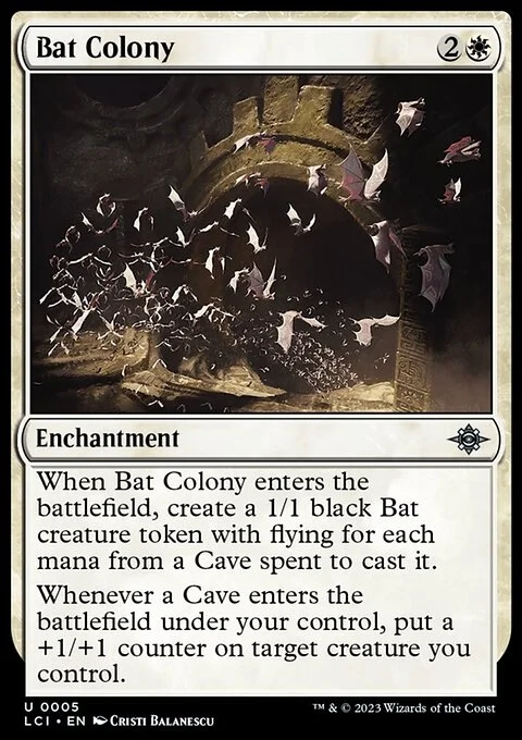 When Bat Colony enters the battlefield, create a 1/1 black Bat creature token with flying for each mana from a Cave spent to cast it. Whenever a Cave enters the battlefield under your control, put a +1/+1 counter on target creature you control.