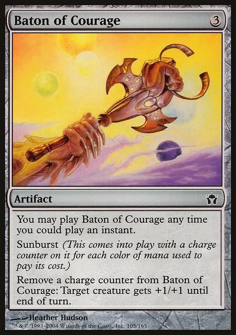 Flash Sunburst (This enters with a charge counter on it for each color of mana spent to cast it.) Remove a charge counter from Baton of Courage: Target creature gets +1/+1 until end of turn.