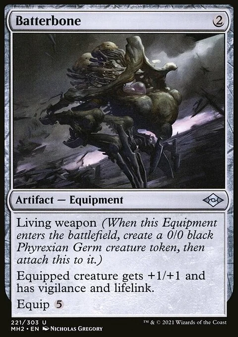 Living weapon (When this Equipment enters the battlefield, create a 0/0 black Phyrexian Germ creature token, then attach this to it.) Equipped creature gets +1/+1 and has vigilance and lifelink. Equip {5}