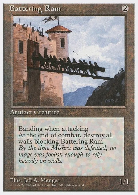 At the beginning of combat on your turn, Battering Ram gains banding until end of combat. (Any creatures with banding, and up to one without, can attack in a band. Bands are blocked as a group. If any creatures with banding you control are being blocked by a creature, you divide that creature's combat damage, not its controller, among any of the creatures it's blocking.) Whenever Battering Ram becomes blocked by a Wall, destroy that Wall at end of combat.