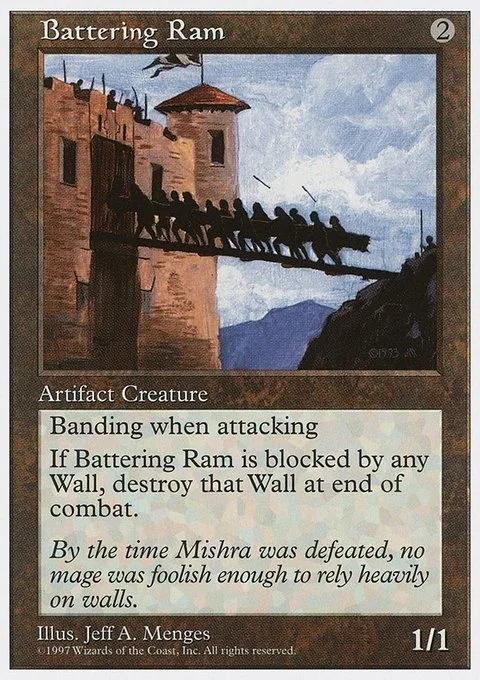 At the beginning of combat on your turn, Battering Ram gains banding until end of combat. (Any creatures with banding, and up to one without, can attack in a band. Bands are blocked as a group. If any creatures with banding you control are being blocked by a creature, you divide that creature's combat damage, not its controller, among any of the creatures it's blocking.)
