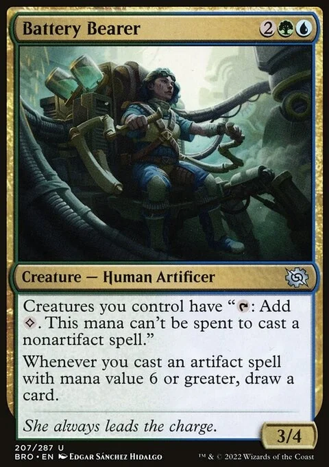Creatures you control have "{T}: Add {C}. This mana can't be spent to cast a nonartifact spell." Whenever you cast an artifact spell with mana value 6 or greater, draw a card.