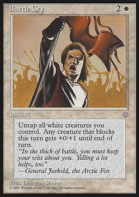 Untap all white creatures you control. Any creature that blocks this turn gets +0/+1 until end of turn.