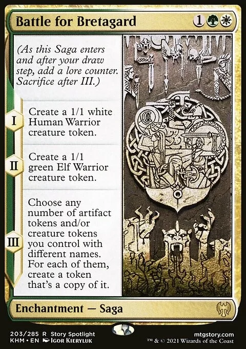 (As this Saga enters and after your draw step, add a lore counter. Sacrifice after III.) I — Create a 1/1 white Human Warrior creature token. II — Create a 1/1 green Elf Warrior creature token. III — Choose any number of artifact tokens and/or creature tokens you control with different names. For each of them, create a token that's a copy of it.