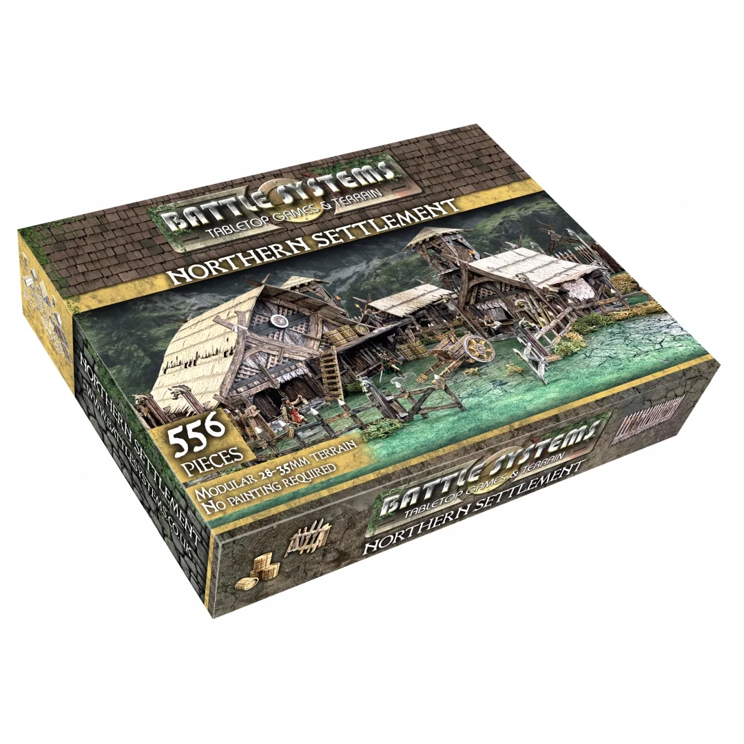 This box contains all the terrain you need for a complete gaming table set in a wooden settlement out on the plains, suitable for many 28-35mm fantasy and historical games. You can build a tightly packed settlement on a small skirmish board or spread the pieces out over a larger table. Many of the pieces are modular and can be assembled in any combination you choose for a different set-up every time. The roofs are removable and the buildings have fully detailed interiors.