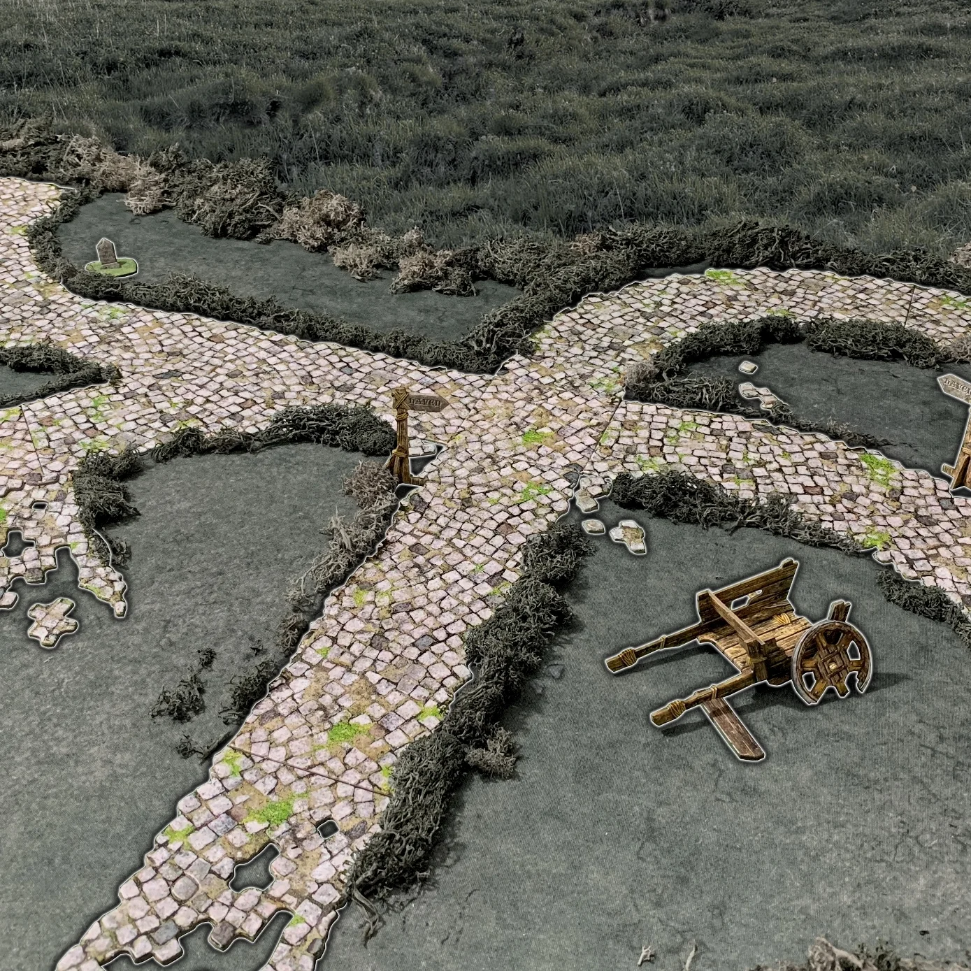 This pack upgrades your gaming table with a cobbled road or a flowing river. Each double-sided section is approx. 8″ / 20cm long with a full pack stretching almost 6 feet / 180cm! The set includes various junctions as well as signposts and other scatter terrain to add immersion to your board. The pieces are compatible with the rest of the Battle Systems Fantasy range.