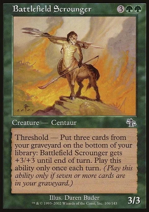Threshold — Put three cards from your graveyard on the bottom of your library: Battlefield Scrounger gets +3/+3 until end of turn. Activate only once each turn and only if seven or more cards are in your graveyard.