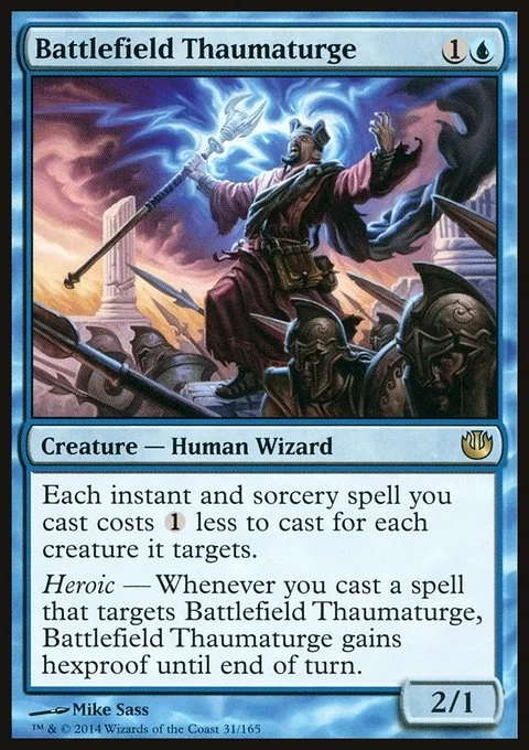Each instant and sorcery spell you cast costs {1} less to cast for each creature it targets. Heroic — Whenever you cast a spell that targets Battlefield Thaumaturge, Battlefield Thaumaturge gains hexproof until end of turn.