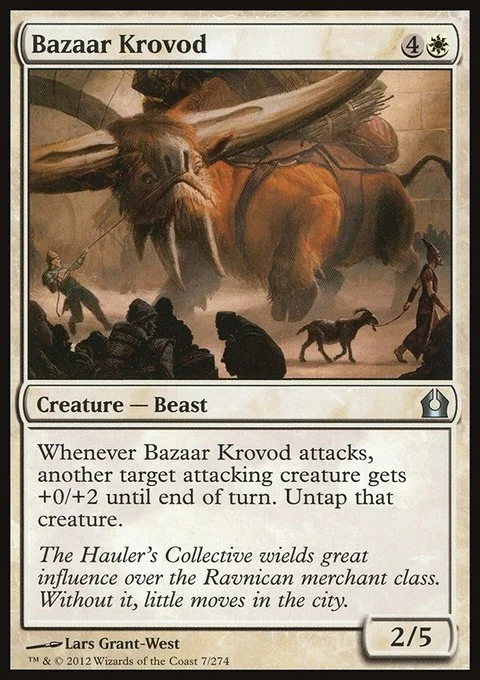 Whenever Bazaar Krovod attacks, another target attacking creature gets +0/+2 until end of turn. Untap that creature.