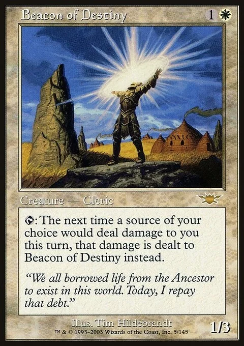 {T}: The next time a source of your choice would deal damage to you this turn, that damage is dealt to Beacon of Destiny instead.