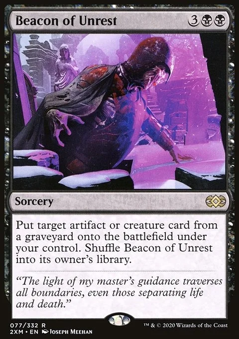 Put target artifact or creature card from a graveyard onto the battlefield under your control. Shuffle Beacon of Unrest into its owner's library.