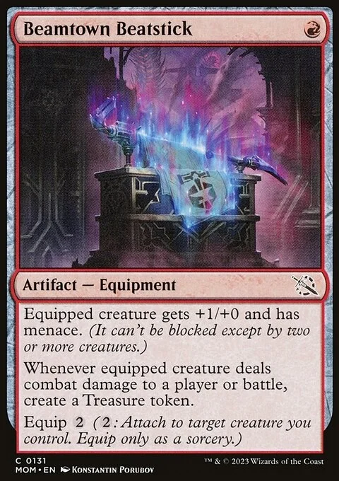 Equipped creature gets +1/+0 and has menace. (It can't be blocked except by two or more creatures.) Whenever equipped creature deals combat damage to a player or battle, create a Treasure token. Equip {2} ({2}: Attach to target creature you control. Equip only as a sorcery.)